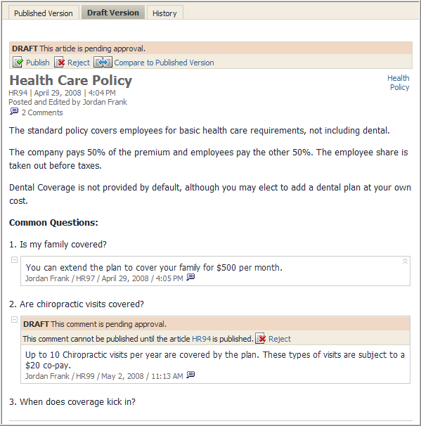 In the example below, there are simple controls to Publish or Reject a Draft version. You can also Unpublish or Reject currently published versions. Once an article version is published, then any pending Draft comments may also be published.