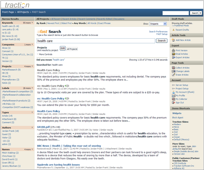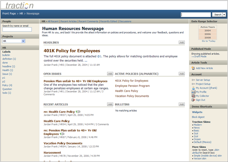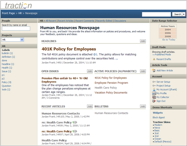Traction Release 4.0's collection of features makes work-in-progress collaboration easy while keeping the "latest stable" version visible for reference. People who have "Read Drafts" permission can work in a Draft mode which shows the latest working version of content across the TeamPage server - or flip to a Published mode to show the latest stable (published) view of all content.
