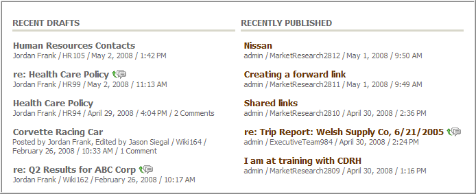Search results (TeamPage Attivio style results shown here) also can present Draft content, Published content - or both. By default, people who can read both Draft and Published content see search results that include the most recent Published results as well as any more recent versions that are still Drafts.